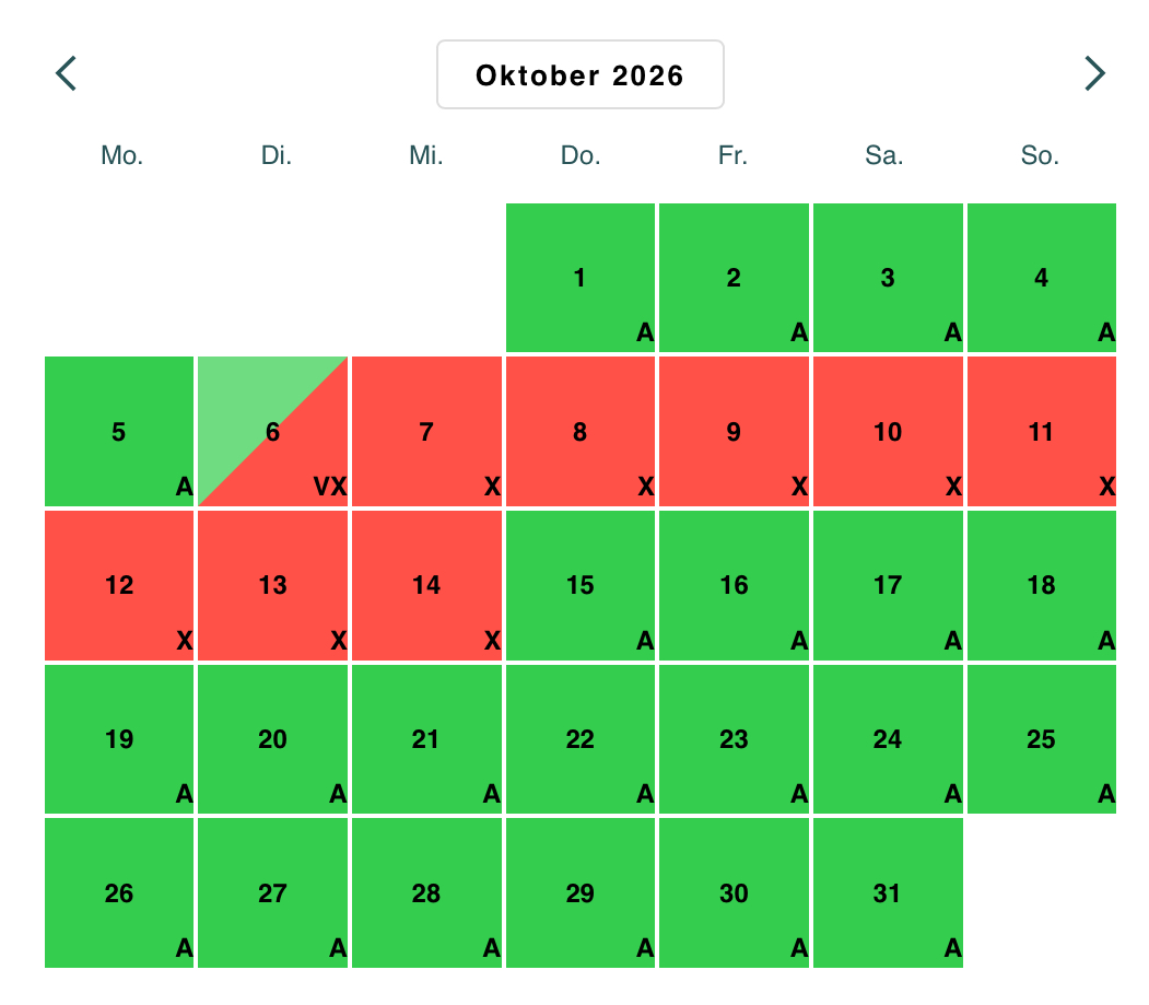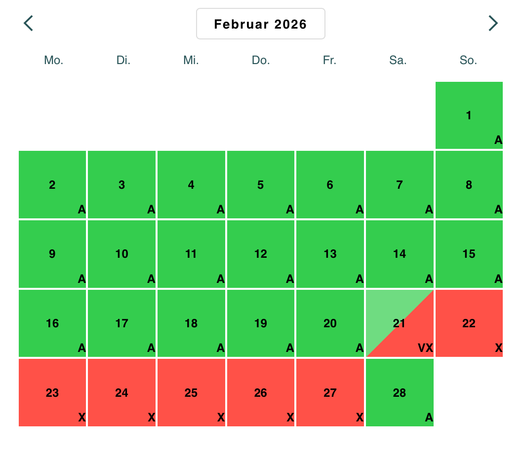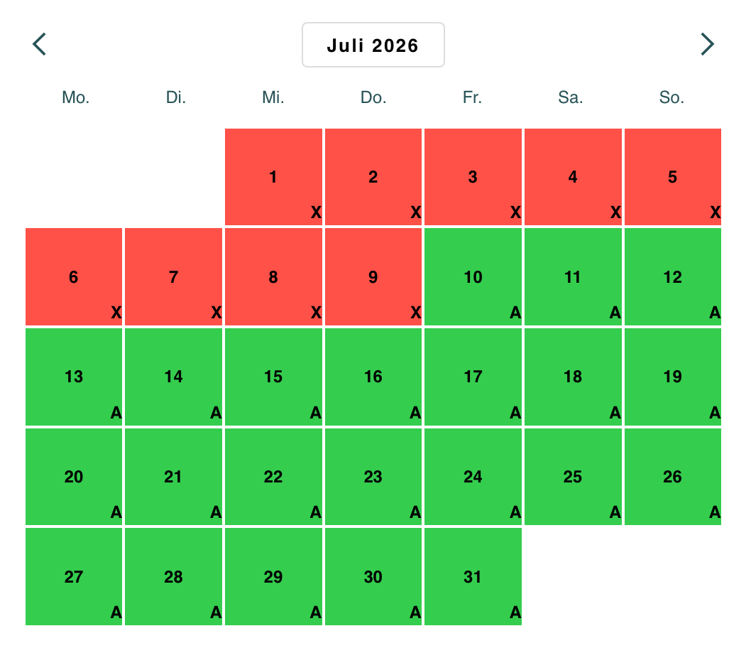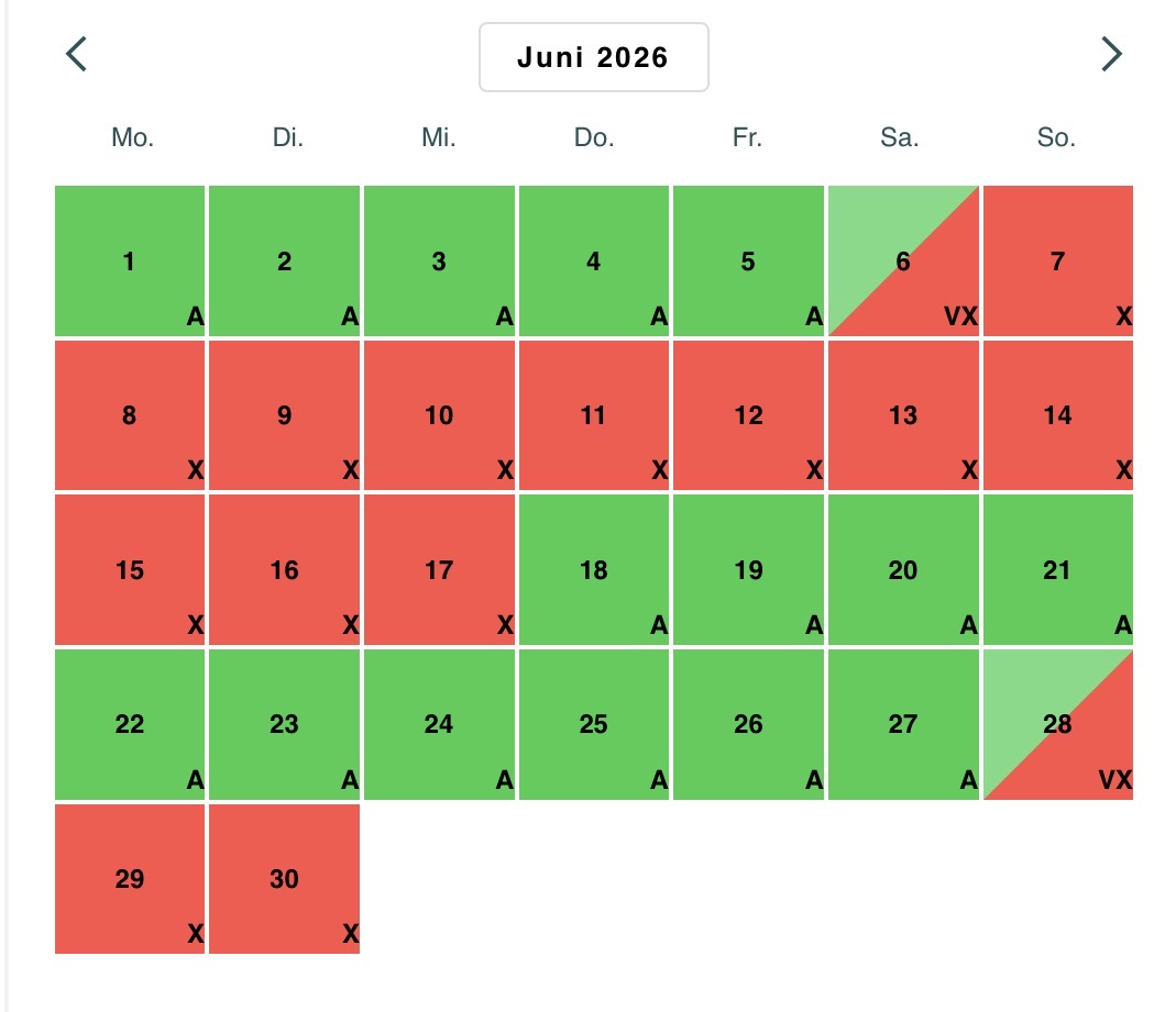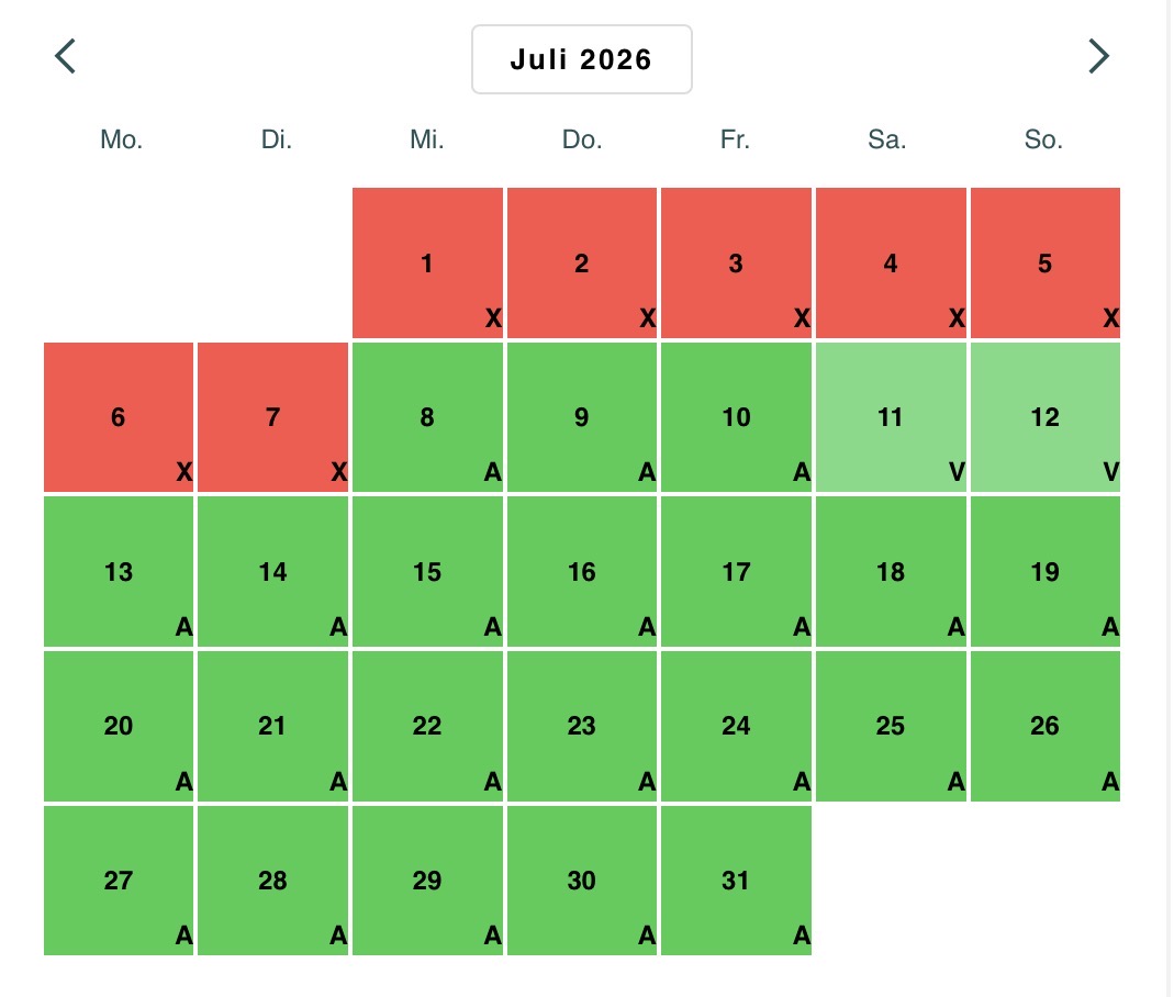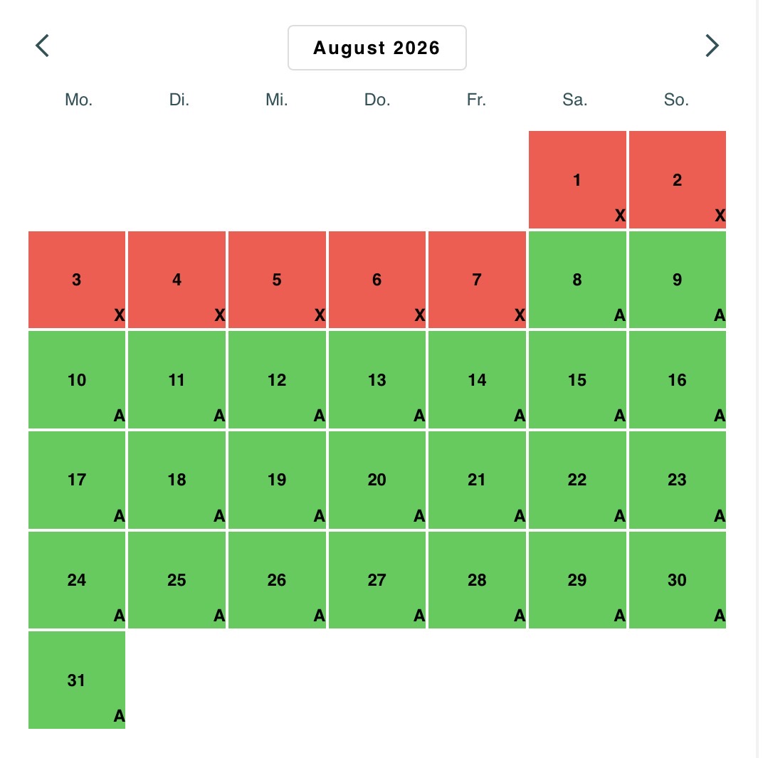 Abreisen am Mo und Di sind aus organisatorischen Gründen leider nur eingeschränkt und auf Nachfrage möglich. Bei einer Preisanfrage oder Reservierung klicken Sie bitte auf den nachfolgenden Link teilen Sie uns bitte die gewünschte Reisezeit und die Personenanzahl mi